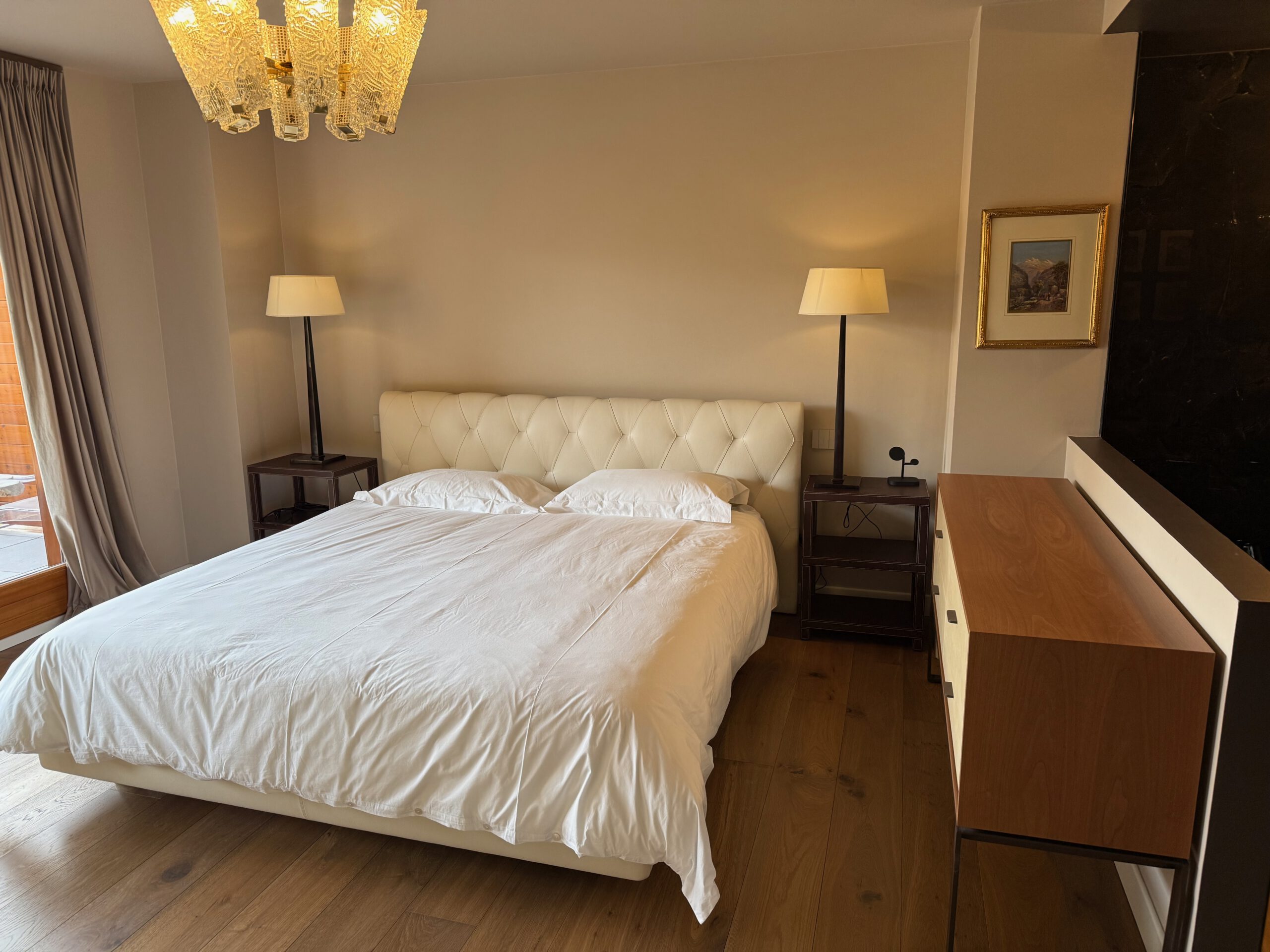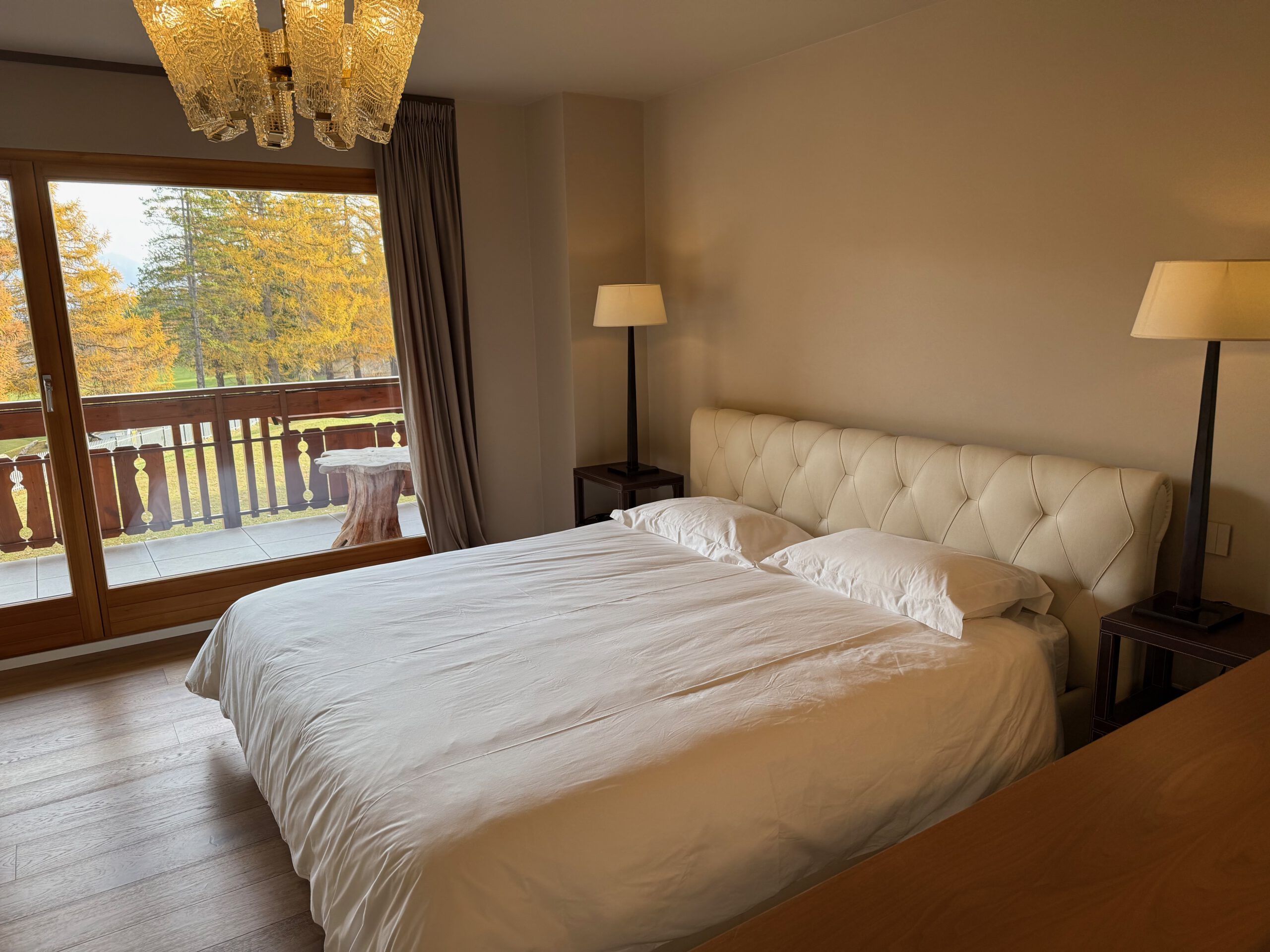 Position Top, centre de Crans, le bien se trouve en bordure du fameux Golf JNK à côté du lac l’Étang Long, dans une belle résidence, au calme. Ce bel appartement de 5.5 pièces REFAIT A NEUF au rez de jardin et balcon offre une surface d’environ 166 m2 + 49.30 m2 de balcon + 20 m2 de jardin (surface pondérée 200.65 m2). L’appartement est entièrement rénové en 2024, avec des matériaux de hautes de gamme, armoires sur mesure et mobilier luxueux (Giorgetti, Poltrona Frau, etc.) Vous apprécierez : Deux entrées, 1 hall avec vestiaire, son Wc invités, son beau séjour avec cheminée donnant sur le jardin privé, un coin à manger, sa cuisine séparée bien équipée avec balcon, une buanderie équipée, 1ere chambre à coucher avec balcon donnant sur le Golf avec salle de bain complète, 2è chambre à coucher, 3è chambre à coucher, une salle de douche complète, 4è chambre est une suite parentale avec un accès au balcon et sa salle de bain et douche complète, mobiliers inclus.